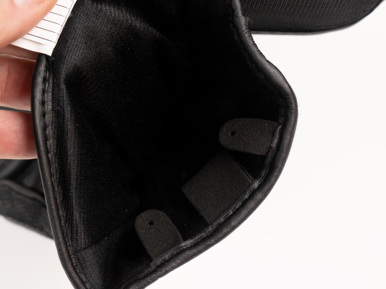 The fingers are precurved, and the finger leather panels are cut to avoid having seams between them. The leather on the top of the glove has a finer grain than what is on the bottom of the fingers and palm – possibly to make it more durable, possibly for appearance.