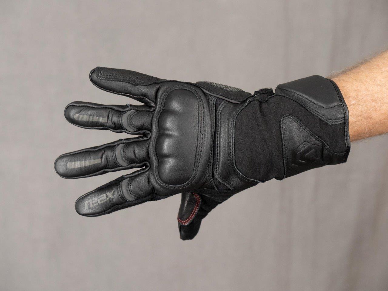 Badging of the gloves is subdued, with a small “REAX” logo sewn into the arm closure, and a heat embossed logo in the panel above it, both done in black. The index fingers have a printed “REAX” logo on them, in gray, with matching small stripes on the middle and ring fingers. These three fingers also have small reflective stretch panels sewn in above the knuckles – more on those later.