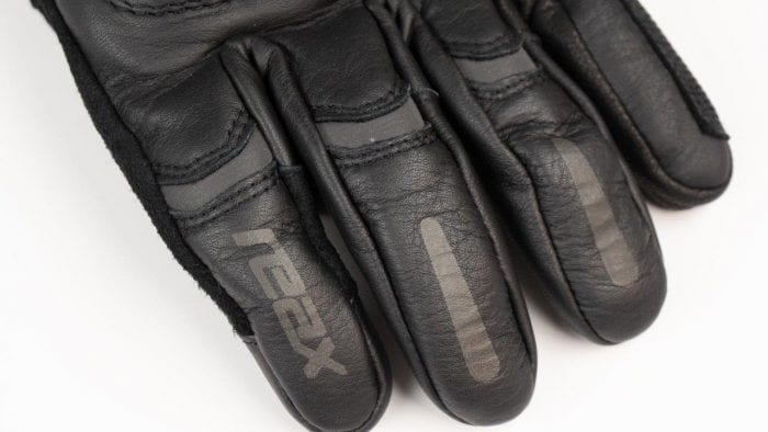 The outside of the thumb, along with the inside of the index finger, are covered in a layer of what feels like suede leather, useful for wiping a visor.