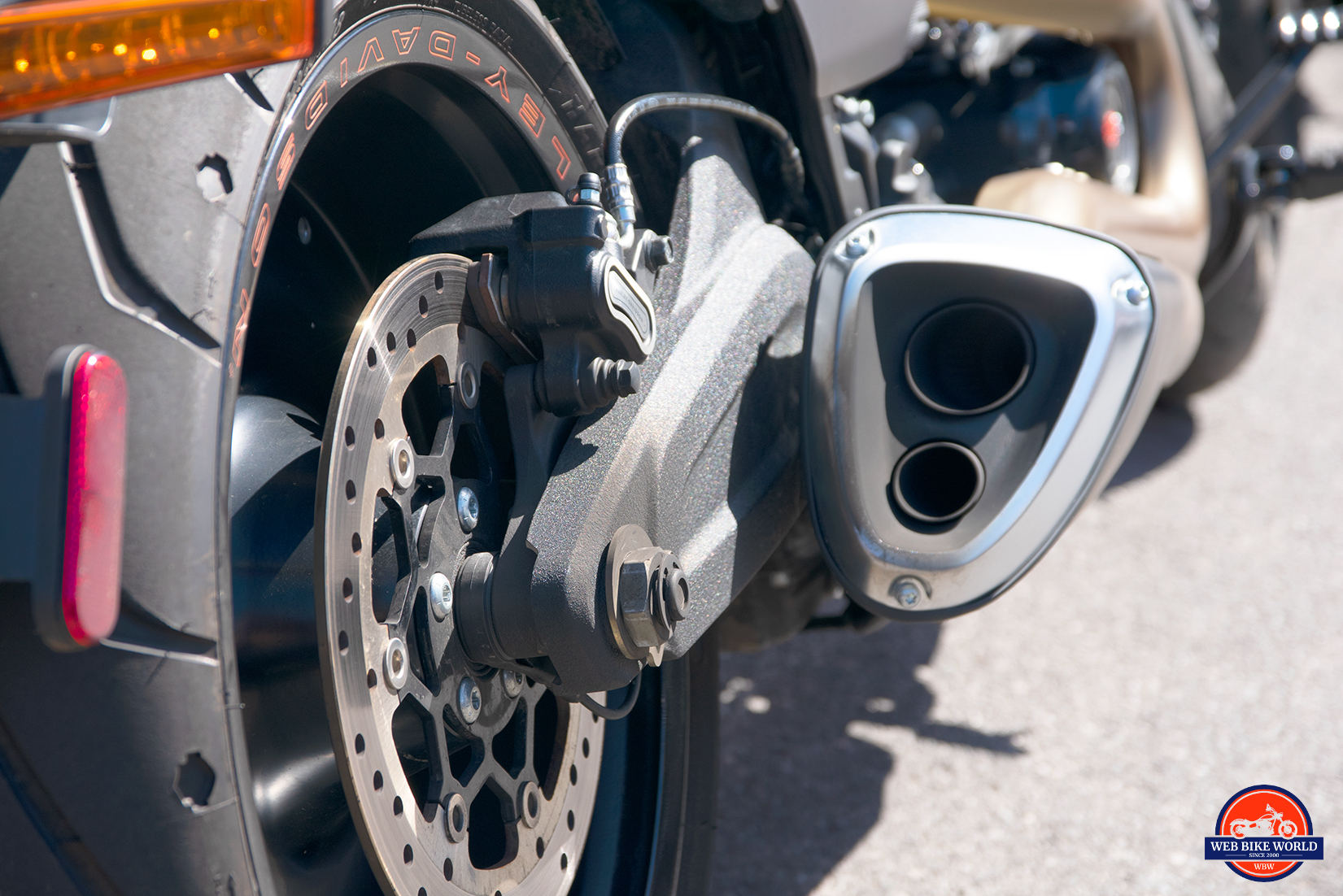 The look is modern and sleek. Very “un-Harley” from a traditional standpoint. Devoid of chrome and somewhat drag bike-esque with dual staggered exhaust openings housed in one canister. The outside edge of the can is tapered noticeably to prevent dragging in the corners.